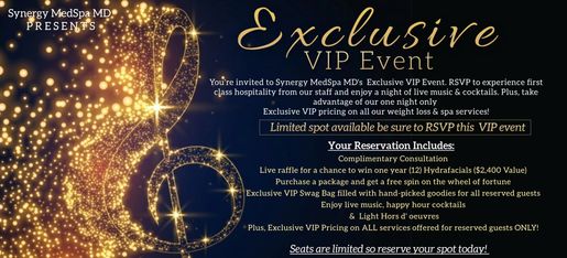 You are personally invited to an unforgettable evening at Synergy MedSpa MD. This invitation-only VIP experience blends first-class hospitality with unbeatable one-night-only savings on our weight loss and spa services.